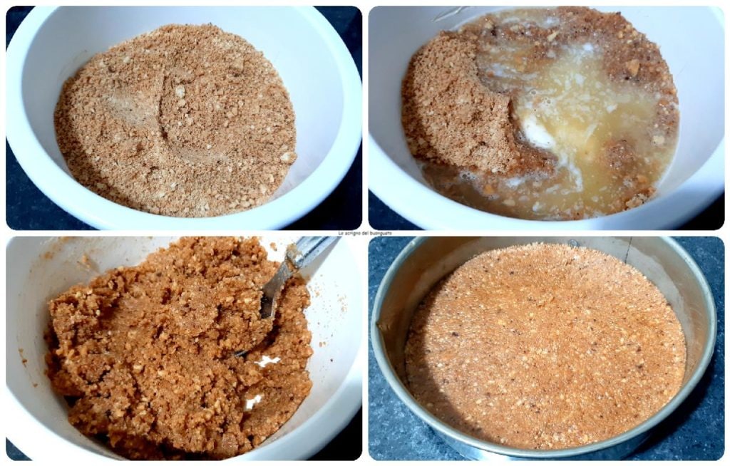 Eine 24 cm Springform nehmen und die Mischung hineingeben, mit der Rückseite eines Löffels glattstreichen.