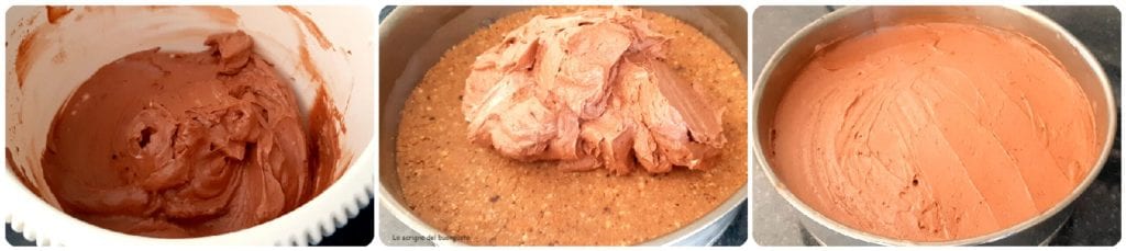 Die Tortenform mit dem gekühlten Keksboden nehmen, die vorbereitete Creme darauf gießen und mit der Rückseite des Löffels gut glattstreichen, um eine gleichmäßige Schicht zu schaffen.