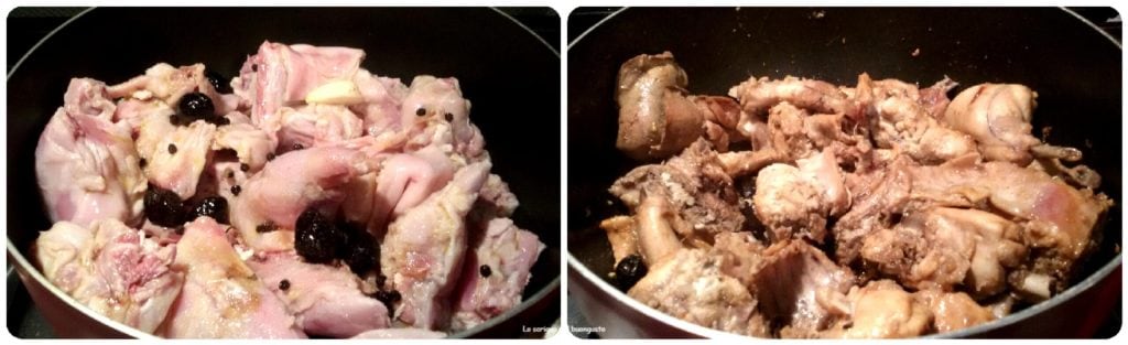Wenn es Zeit ist, das Kaninchen zu kochen, abtropfen lassen (eine Tasse Flüssigkeit auffangen, sie könnte während des Kochens benötigt werden) und in eine hohe Pfanne geben, die Knoblauchzehen, Salz, Pfefferkörner, schwarze Oliven, das extra native Olivenöl hinzufügen und gut umrühren, damit sich alle Zutaten verbinden.
