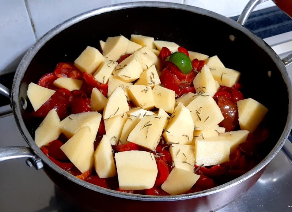 Thymian, eine Prise Salz hinzufügen und etwa 20-25 Minuten kochen lassen, gelegentlich umrühren und bei Bedarf etwas Wasser hinzufügen, bis die Kartoffeln weich, aber fest und die Paprika perfekt gekocht sind.