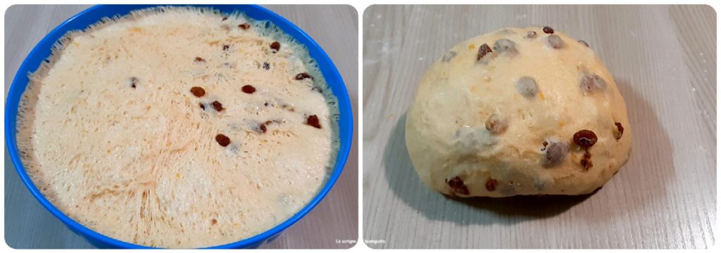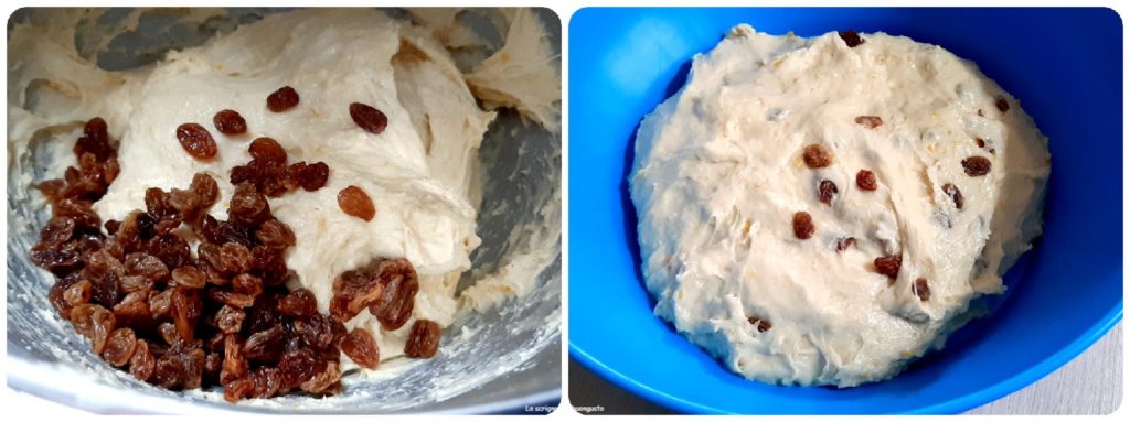 Schließlich die Vanille hinzufügen, noch einmal kneten und dann die Sultaninen gut abtropfen lassen und zum Teig geben, lange kneten, bis alles sehr homogen ist und der Teig, wenn man ihn zwischen die Hände nimmt und ein wenig zieht, nicht durchsichtig und elastisch erscheint.