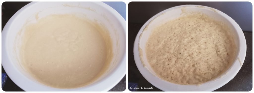 In einer Schüssel die Hefe mit dem lauwarmen Wasser vermischen und gut rühren, das Mehl hinzugeben und nochmals mischen. Den Vorteig etwa 30/45 Minuten aufgehen lassen.