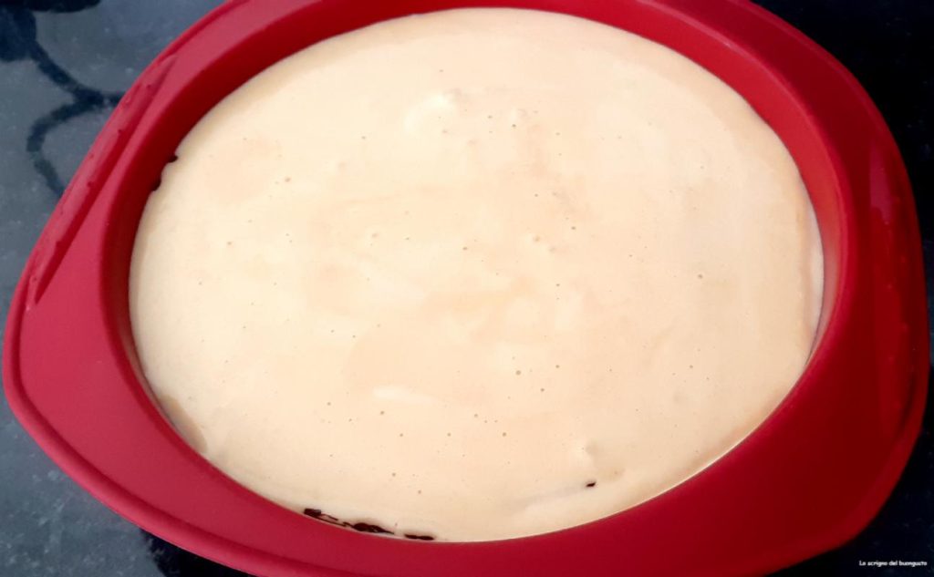 Jetzt eine Form von 22-24 cm Durchmesser nehmen, einfetten und mit Mehl bestäuben oder wie ich eine Silikonform verwenden, die Hälfte der Mischung hineingießen und im vorgeheizten Ofen bei 180 °C für 15 Minuten backen.