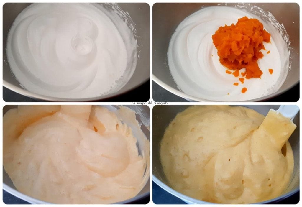 In der Rührschüssel oder in einem mit Schneebesen ausgestatteten Gerät die Eiweiße mit dem Zucker aufschlagen, dann die anderen Zutaten von Hand hinzufügen, um die Mischung nicht zu zerstören.