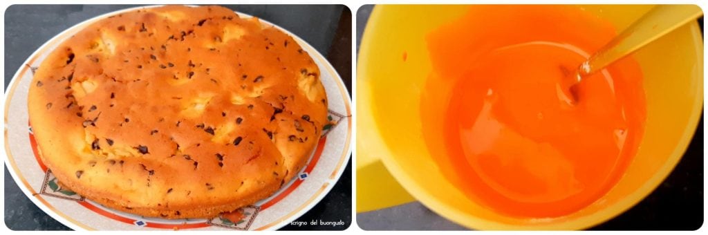 • Nach dem Backen aus dem Ofen nehmen, ein wenig abkühlen lassen, dann auf eine Servierplatte legen und wenn es vollständig abgekühlt ist, die Glasur zubereiten, um die Oberfläche zu bedecken.
