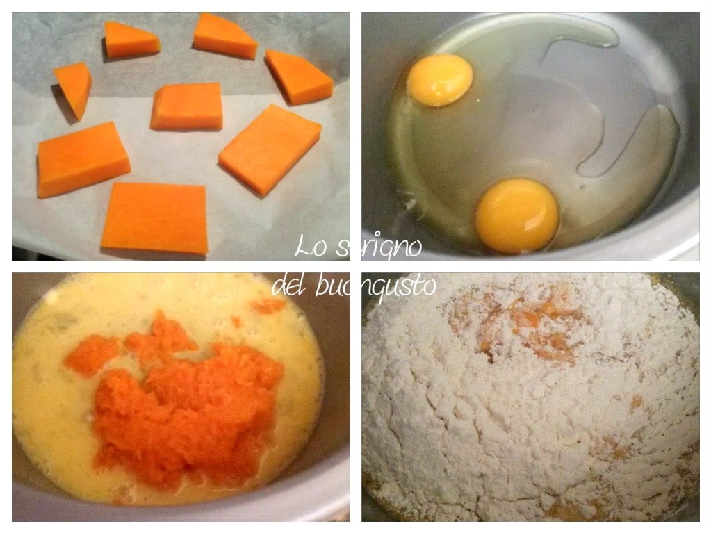 In einer Schüssel die Eier aufschlagen, dann das pürierte Kürbisfleisch hinzufügen, gut vermischen, das Mehl und das Salz dazugeben, den Teig auf einer Arbeitsfläche kneten, bis er weich und nicht klebrig ist.