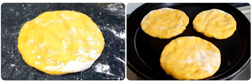 • Nach dem Ruhen eine Pfanne mit dickem Boden erhitzen, die Kugeln mit den Händen auf einen Durchmesser von etwa 12 cm drücken und in die heiße Pfanne legen, auf mittlerer Hitze regulieren und mit einem Deckel abdecken.