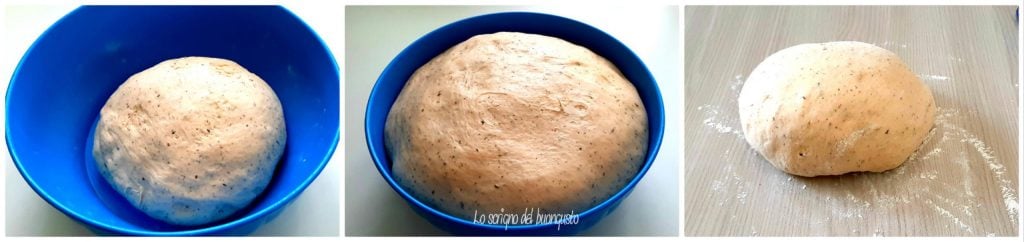 Für die Brotbackmaschine, sobald sie das Kneten beendet hat, den Teig auf eine bemehlte Fläche kippen und einige Minuten kneten, bis ein Ball entsteht, und ihn dann für etwa 2 Stunden in einer großen Schüssel gehen lassen.