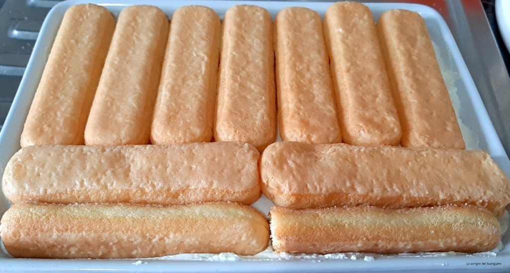 In einer nicht sehr großen Auflaufform die in der Zitronenlösung getränkten Löffelbiskuits als Basis legen und dann eine Schicht Mascarpone-Creme darüber verteilen.
