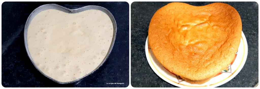 Eine herzförmige Backform fetten und mehlen, die erhaltene Masse in die Form geben, glatt streichen und im vorgeheizten Ofen bei 180°C für etwa 35 Minuten backen.
