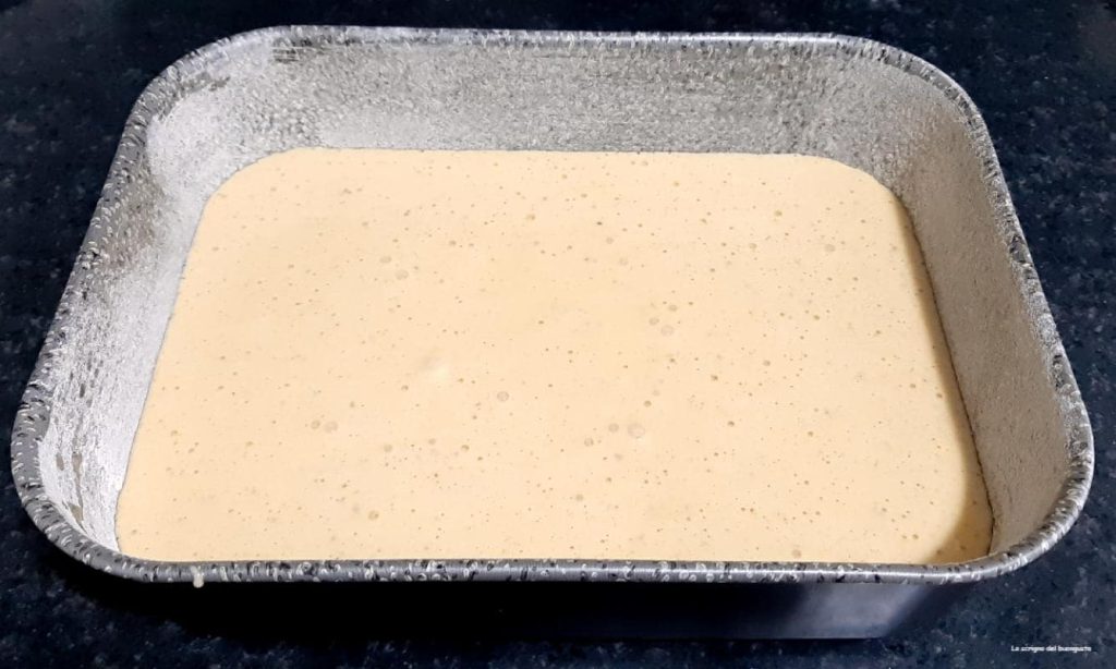 Den Ofen auf 150°C vorheizen, währenddessen eine Form von etwa 40×25 cm einfetten und bemehlen und die erhaltene Mischung hinein gießen.
