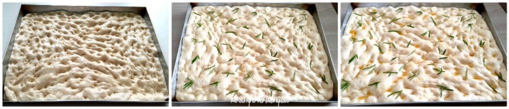Es ist typisch, mit den Fingern kleine Vertiefungen in die Oberfläche zu machen, damit das Fladenbrot besser das Öl hält. Das typische Gewürz für dieses Fladenbrot besteht aus Öl, Salz und Rosmarin oder mit Zwiebeln.
