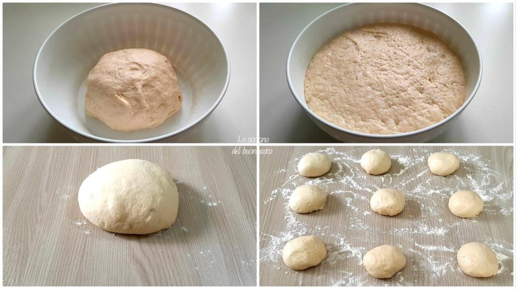 An einem warmen Ort gehen lassen, bis sich das Volumen verdoppelt hat, dann das Mehl leicht auf die Arbeitsfläche streuen, den Teig dorthin geben, in mittelgroße Kugeln von etwa 80-90 g teilen