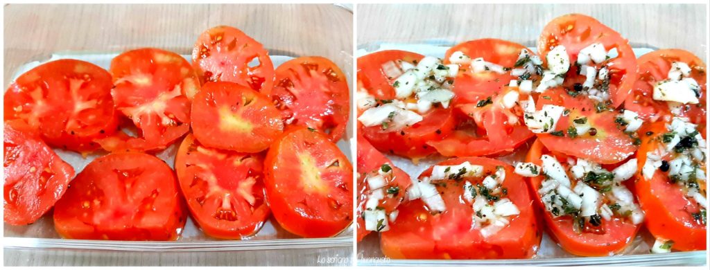 Eine Auflaufform nehmen, die Tomaten in Scheiben schneiden und hineinlegen, mit einem Löffel die Kräuter aus der Marinade nehmen und über die Tomaten streuen, mit Salz und extra nativem Olivenöl abschmecken, dann eine zweite Schicht machen und wieder mit Kräutern, Salz, extra nativem Olivenöl und den Basilikumblättern zum Garnieren.