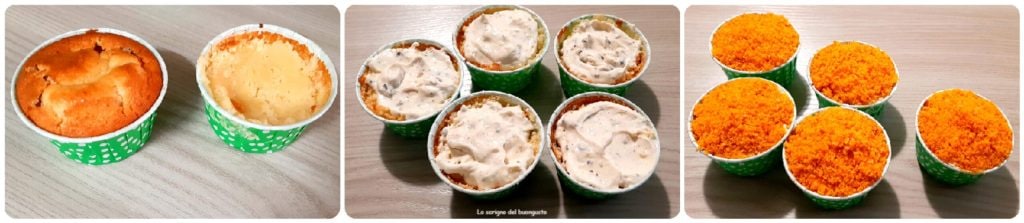 Sobald die Muffins gebacken und abgekühlt sind, die obere Kuppel der Muffins abschneiden und beiseite legen… …im Inneren der Muffins mit den Händen eine Vertiefung schaffen, da sie sehr weich sind, wird es einfach sein.