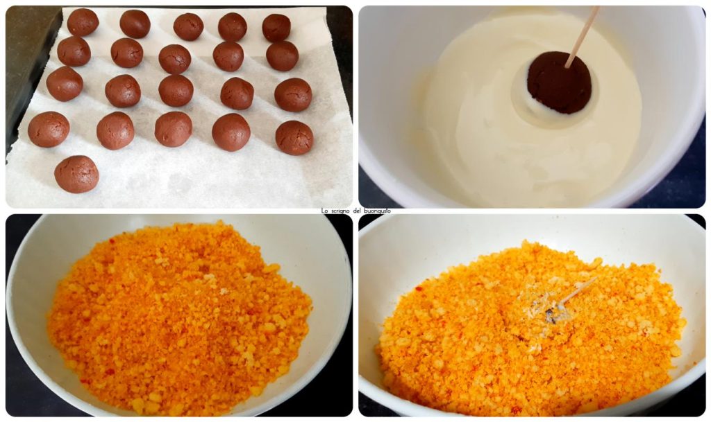 Wenn alles bereit ist, nehmen Sie einen Trüffel nach dem anderen mit einem Zahnstocher und tauchen Sie ihn in die weiße Schokolade, lassen Sie ihn gut abtropfen, bevor Sie ihn in die zerbröckelte Biskuitmasse tauchen.
