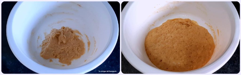 Nach Ablauf der Zeit den aufgegangenen Teig in die Küchenmaschine geben, oder ihr könnt alles von Hand machen, und alle Zutaten nach und nach hinzufügen, zuerst mit dem Blattwerkzeug kneten, dann am Ende der Zugabe der Zutaten mit dem Teighaken weiter kneten.