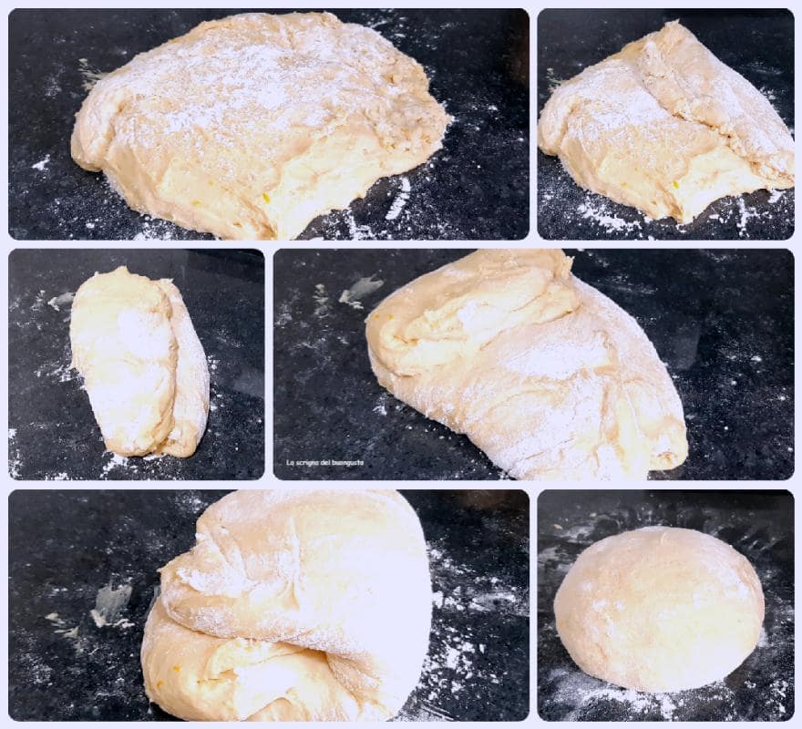 Wenn der Teig aufgegangen ist, auf eine bemehlte Arbeitsfläche geben, leicht mit Mehl bestäuben und Falten bilden, den Vorgang zweimal wiederholen.