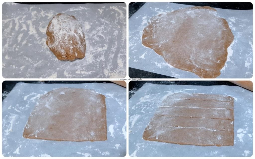 Den Teig in vertikale Streifen von etwa 2 Finger Breite schneiden, dann schräg schneiden, um den klassischen Schnitt des Mostaccioli zu erhalten.