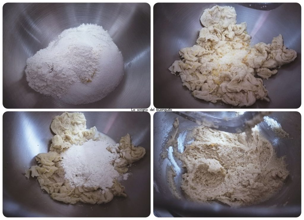 In der Küchenmaschine das Teighaken einsetzen und den gereiften Biga, die geriebene Zitronen- und Orangenschale, den Zucker, etwas Mehl hinzufügen und einige Sekunden kneten