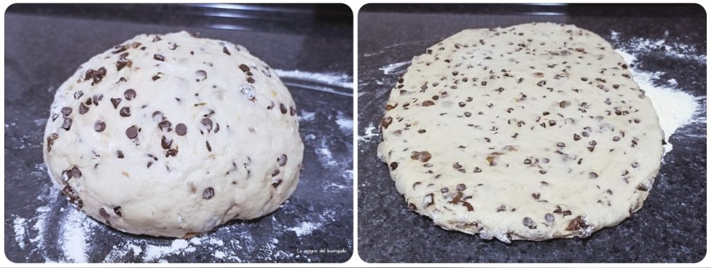 Nun das Teighaken entfernen und den Knethaken einsetzen, die Verarbeitung beenden und schließlich die abgetropften und gut ausgedrückten Rosinen und die Schokoladentropfen hinzufügen, nur wenige Sekunden kneten.