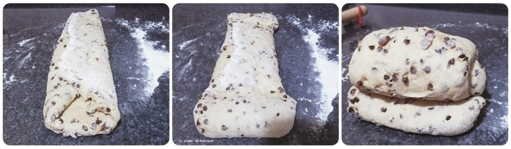 Den Teig in drei Längsrichtungen falten, dann flach drücken und ein Oval erhalten, an dieser Stelle die breite Seite eine in die andere falten (siehe Bild).