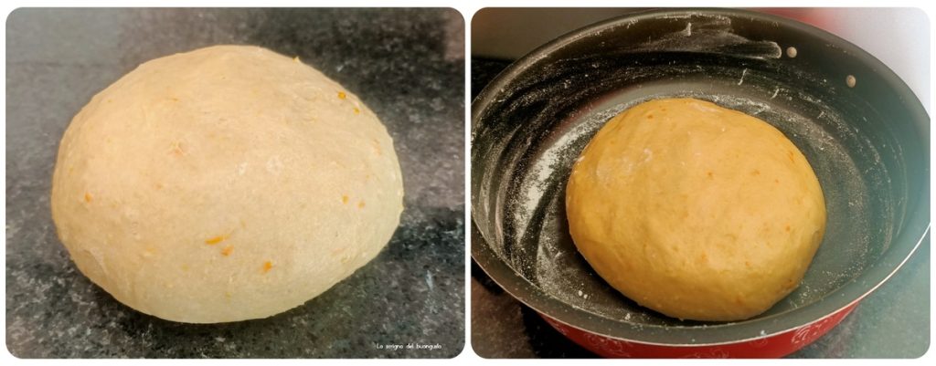 Sobald der Teig fertig ist, in eine große Schüssel geben und etwa 2 Stunden gehen lassen, bzw. bis sich das Volumen erneut verdoppelt hat.