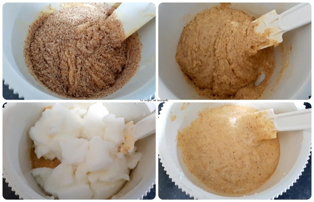 • Ich habe die Eier getrennt mit einem Handrührgerät aufgeschlagen, aber wenn Sie eine Küchenmaschine haben, können Sie den Schneebesenaufsatz verwenden. Zuerst die Eiweiße schlagen und dann bei niedriger Geschwindigkeit nach und nach die Eigelbe hinzufügen. Danach die Zutaten in der Küchenmaschine nach und nach hinzufügen, so werden Sie keine Probleme haben, dass die Masse zusammenfällt.