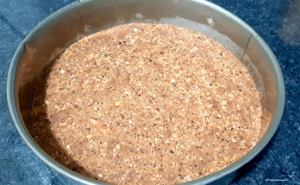 • Zuerst die Kekse nehmen, sie zusammen mit der leicht erweichten Butter pürieren, dann eine 24 cm große Springform nehmen und auf den Boden Backpapier legen, die Kekse darauf verteilen und mit einem Spatel die gesamte Basis bedecken, anschließend mit der Rückseite des Löffels alles gut andrücken, die Basis gut auch an den Rändern anpassen.