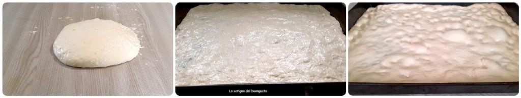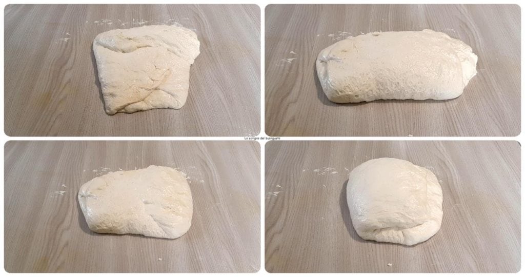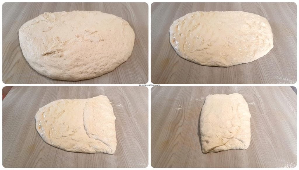 Nach mindestens 24 Stunden stellen wir die Schüssel mit dem Teig in den Ofen mit eingeschaltetem Licht. Sobald die Gärung erreicht ist, ölen Sie eine Arbeitsfläche ein, ölen Sie auch Ihre Hände, gießen Sie den Teig darauf und beginnen Sie, die Falten zu machen.