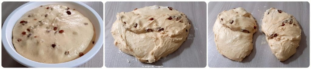 Sobald der Teig gearbeitet ist, die Rosinen abspülen und gut abtropfen lassen, zum Teig hinzufügen und nur so lange kneten, bis sie gut eingearbeitet sind.