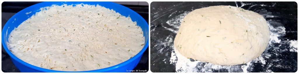 Sobald der Teig aufgegangen ist, ihn auf eine bemehlte Fläche gießen, eine Kugel formen und in 8 Teile teilen, um etwa 180 g. große Teigstücke zu erhalten.