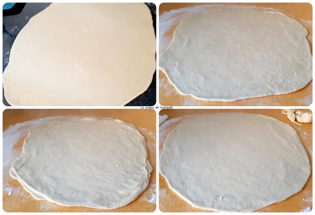 • …die erste Hälfte ausrollen und einen dünnen runden Teig ausrollen, auf eine andere bemehlte Fläche schieben und den zweiten Kreis in derselben Größe ausrollen.
