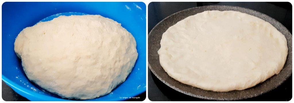 Ein rundes Backblech mit 30-32 cm Durchmesser nehmen, den Boden einfetten und unseren Teig darauf geben, die Focaccia mit einer eingefetteten Hand gut auf dem Blech verteilen und die zuvor zerstoßene gewürzte Salzmischung darüber streuen