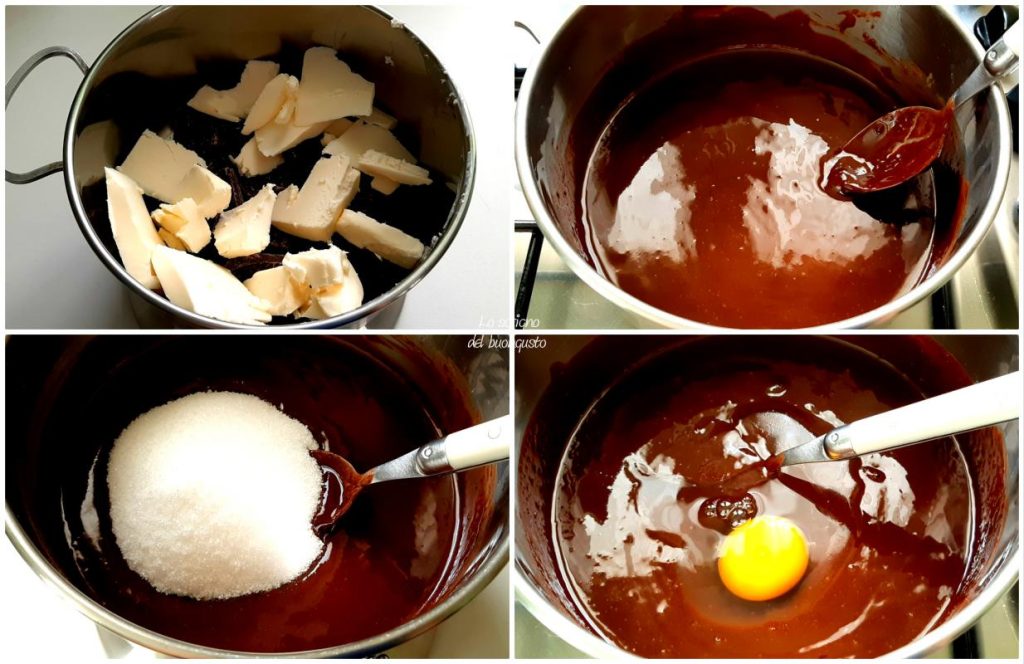 • Die Butter und die Zartbitterschokolade in Stücke in einen Topf mit dickem Boden geben und bei niedriger Hitze schmelzen lassen.