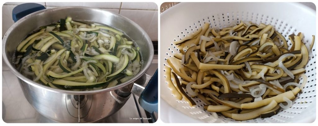 Lassen Sie sie ein paar Minuten abtropfen und legen Sie dann ein Tuch auf eine Arbeitsfläche und verteilen Sie die Zucchini und Zwiebeln für etwa 30 Minuten, dann wechseln Sie das Tuch gegen ein trockenes aus, verteilen Sie erneut das Gemüse darauf und lassen Sie es 24 Stunden lang mit einem weiteren Tuch bedeckt.