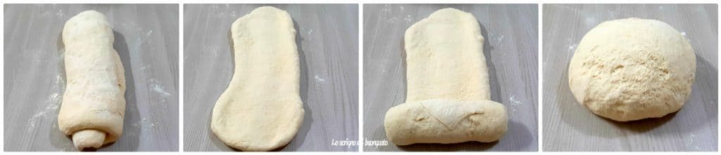 • vertikal drehen und erneut mit dem Nudelholz ein Rechteck formen und wieder aufrollen, um eine Rolle zu bilden, die an den Seiten geschlossen wird, um erneut ein Brötchen zu formen.