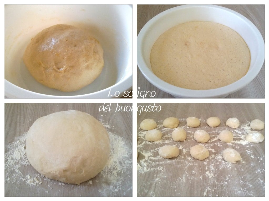 Nehmen Sie eine große Schüssel, geben Sie das lauwarme Wasser und die Milch hinein und lösen Sie die Hefe auf. Fügen Sie dann einen Teil des Mehls hinzu, dann den Zucker und rühren Sie ständig, bis Sie das gesamte vorgesehene Mehl eingearbeitet und einen gleichmäßigen, gut verarbeiteten Teigball erhalten haben. Sobald ein Ball geformt ist, mit den 20 ml nativem Olivenöl extra weiterarbeiten und an einem warmen Ort etwa 2 Stunden oder bis zur Verdopplung des Volumens gehen lassen.