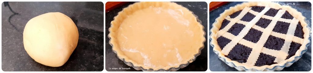 Nach der Zeit den Teig auf einer bemehlten Fläche ausrollen und in eine Kuchenform legen, die Marmelade (ich habe hausgemachte Traubenmarmelade verwendet) darauf verteilen und mit einigen Streifen Mürbeteig wie auf dem Foto verzieren.