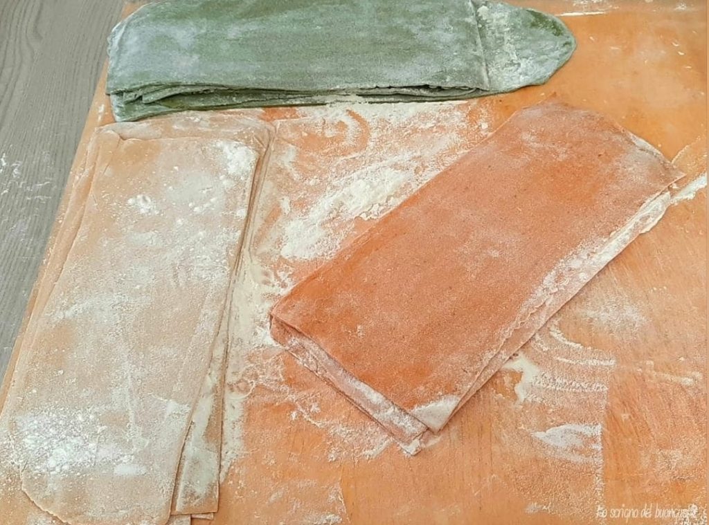Am Ende gibt es 3 Stapel mit Blättern in 3 verschiedenen Farben, ich habe sie etwas dicker gemacht, aber weil wir in den Abruzzen die Pasta etwas dicker mögen, könnt ihr das natürlich nach eurem Geschmack machen.