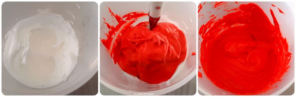 In einem hohen Behälter die Sahne, die rote Lebensmittelfarbe einfüllen und die Sahne schlagen.