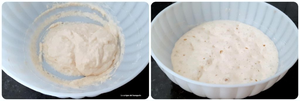 Das Vorteig, das sich verdoppelt hat, in die Rührmaschine oder Küchenmaschine geben, bei niedriger Geschwindigkeit mischen und die Milch, 200 g Mehl Type 0, die weiche Butter hinzufügen, aber alles nach und nach, ein Zutat nach dem anderen.