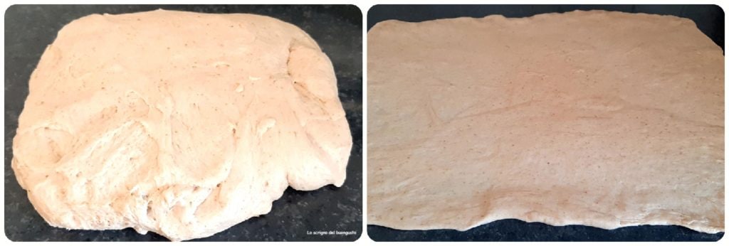 Auch die Prise Salz hinzufügen und das restliche Mehl dazugeben, bis ein weicher, nicht klebriger und gut verarbeiteter Teig entsteht.