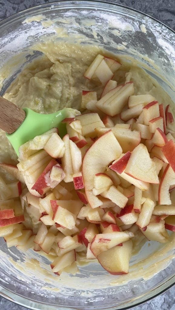Beende die Zubereitung des Pfundkuchens, indem du den Apfel hinzufügst und ihn gut im Teig verteilst.