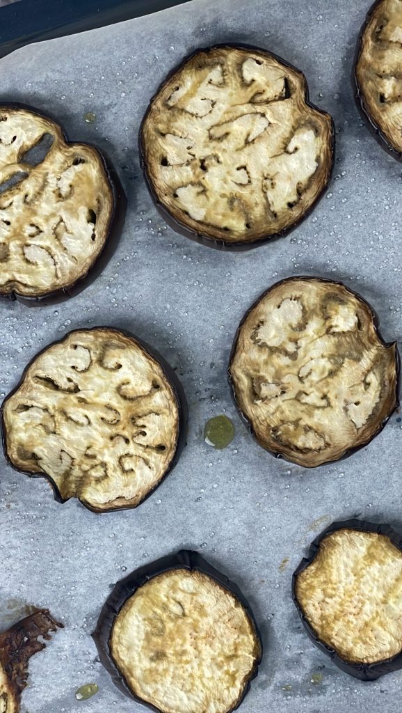 Lege die Auberginenscheiben auf das Backblech und würze sie mit Salz und extra nativem Olivenöl.Backe die Auberginen im statischen Ofen bei 180°C etwa 15 Minuten.