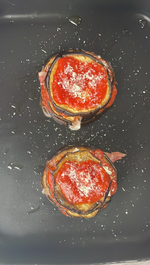 In der Zwischenzeit würze das Tomatenpüree mit Salz und schwarzem Pfeffer.Baue die Aufläufe zusammen: Gib auf eine Auberginenscheibe das gewürzte Tomatenpüree und den geriebenen Parmigiano Reggiano.