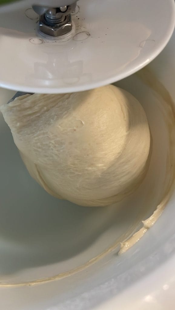 Kneten in der Küchenmaschine mit Spiralhaken für 10-15 Minuten oder bis es sich zusammenzieht.