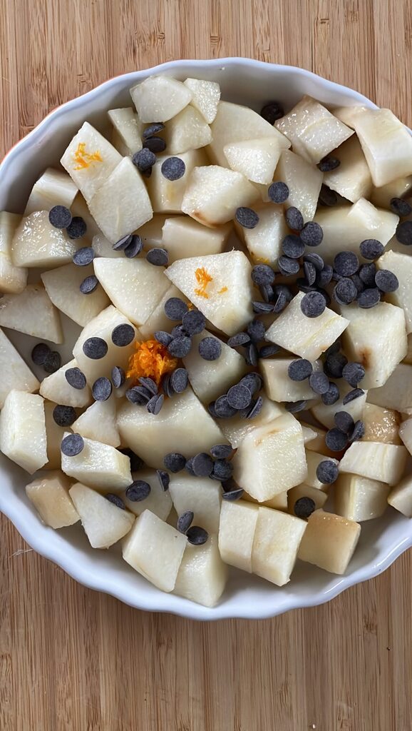 Füge den Birnen die Schokoladentröpfchen und die Schale der anderen halben Orange hinzu.