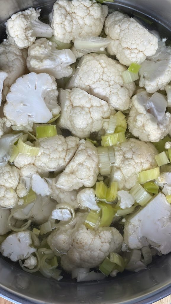 Füge die Blumenkohlröschen zum Lauch hinzu, bedecke sie mit Wasser und koche sie etwa zwanzig Minuten lang.