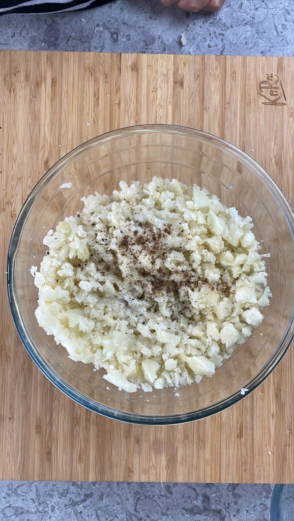 Hacke ihn fein mit einem Messer oder einem Zerkleinerer, achte jedoch darauf, ihn nicht zu einem Püree zu verarbeiten.Würze den gehackten Blumenkohl mit Salz, schwarzem Pfeffer, Knoblauchpulver und einer Prise Muskatnuss.